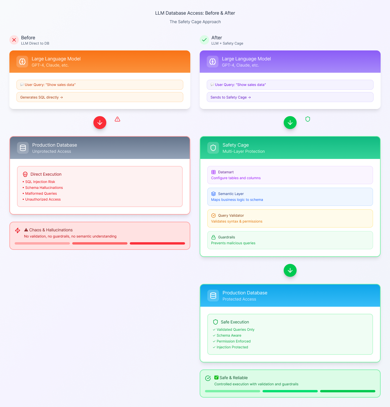 The illustration below captures this shift from the common, unsafe approach where LLMs generate SQL directly against the warehouse, to a governed architecture where every query passes through semantic rules, validation layers, and controlled access before reaching production data.